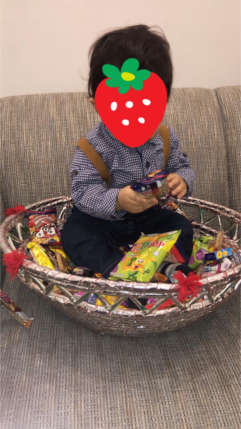 このお祝いは、お菓子やお金を子どもや大人、メイドさんたちに投げて配るスタイルのお祝いで、みんな袋いっぱいにお菓子を拾って赤ちゃんの成長を共にお祝いします。