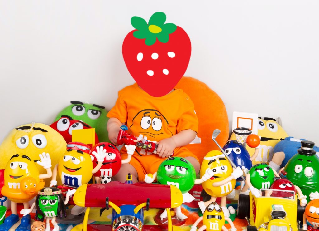 キャラクターのM&Msのロンパースを着てM&Msのおもちゃに囲まれながら撮影しました。